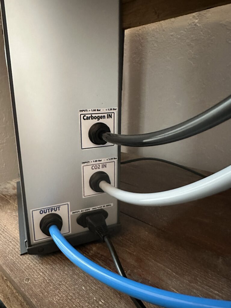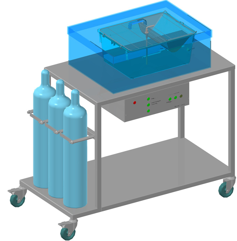 - În prima fază, gazul Carbogen este introdus în partea de jos a cuștii, prin intermediul unei supape controlate prin PLC. Carbogenul este un amestec de gaze de 95% O2 + 5% CO2 . Acest lucru provoacă o concentrație mare de O2 în cușcă și în recipient, în timp ce concentrația de CO2 de 5% nu provoacă nicio reacție la receptorii de CO2 din plămânii animalelor. Nivelul de O2 din sânge devine maxim.